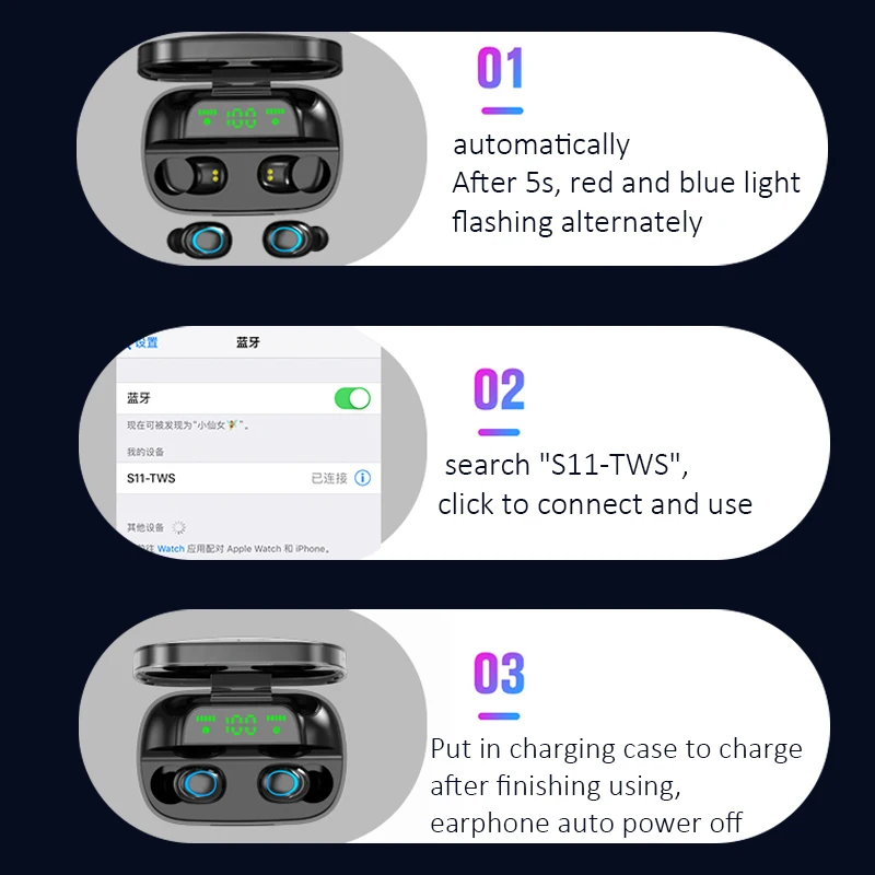 Function: Short press the touch button to answer the call when you call, short press the touch button to hang up the call Reject the call: When you call, press and hold the touch button for 1.5 seconds, then release it and reject it. Pause/Play: Short press the touch button during playback to switch play/pause Next song: Double-click the touch button during playback Previous song: Three-click touch button during playback Start Voice Assistant (Siri): Press and hold the touch button for 1.5 seconds during standby to release, start voice assistant (requires mobile phone support) Features: 1. Touch Control: Designed with a high sensitivity touch sensor, you can easily control the headphones. Pressing the button no longer causes uncomfortable pressure and no longer concerns the water leak in the stitching button. 2. IPX5 waterproof / HD audio stereo: it provides clear and powerful sound, just enjoy wireless listening. They are designed to keep sweat and moisture. 3. HD noise reduction, HD call: DSP noise reduction technology and sensitive microphone default match to recognize speech and environmental noise, reduce noise and improve speech intelligibility. 4. Single/dual style headphones are easy to use with a single earphone, while two earphones allow you to share music with your friends and enjoy the wireless experience. packing list: 2* earphone 1* charging warehouse 4* ear cap 1* instruction manual